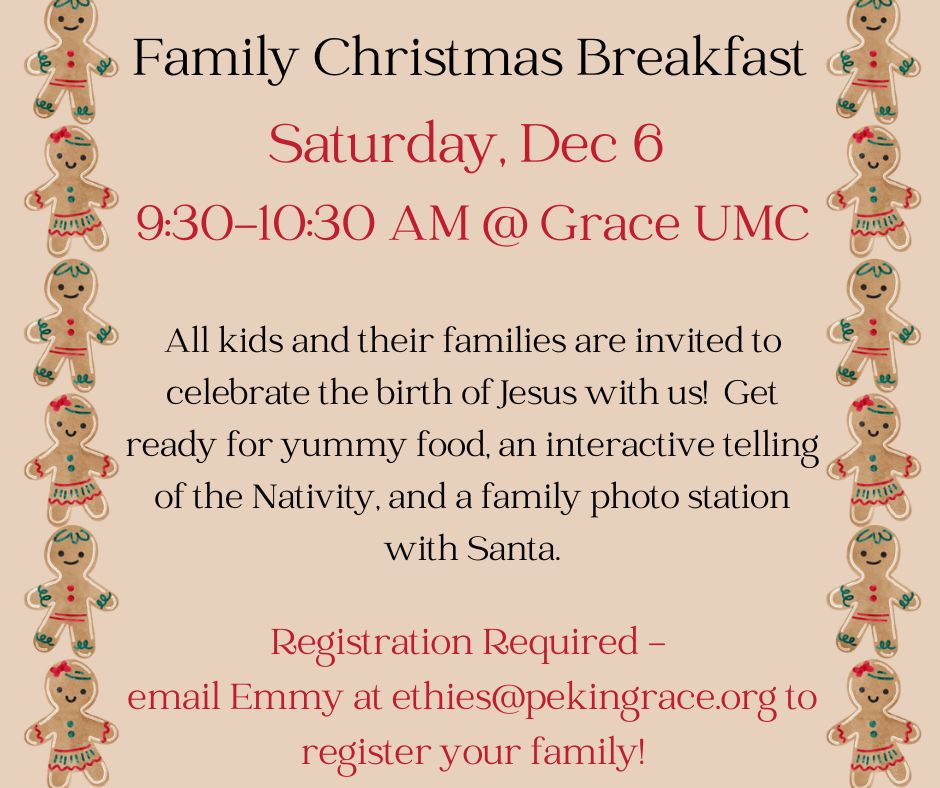 Register to come to the Family Christmas Breakfast at Pekin Grace UMC on Saturday, December 6. The Breakfast will start at 9:30 a.m.